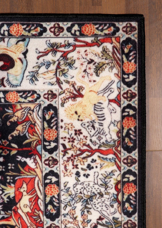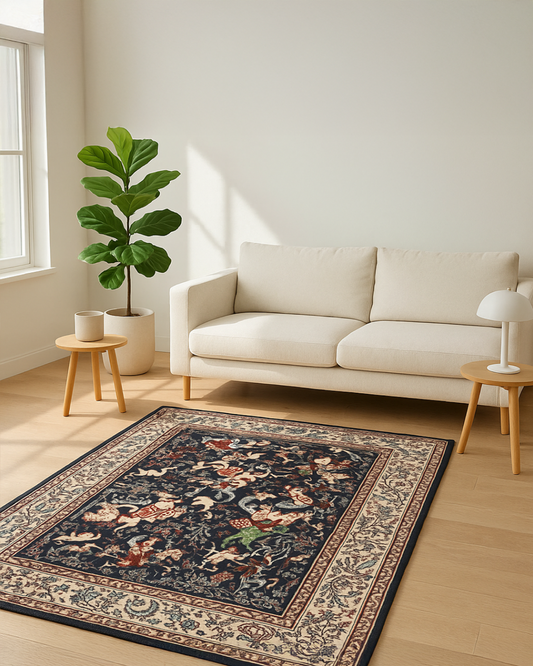 Vintage-Inspired Hunting Scene Rug – Black & Multicolor with TPR Backing
