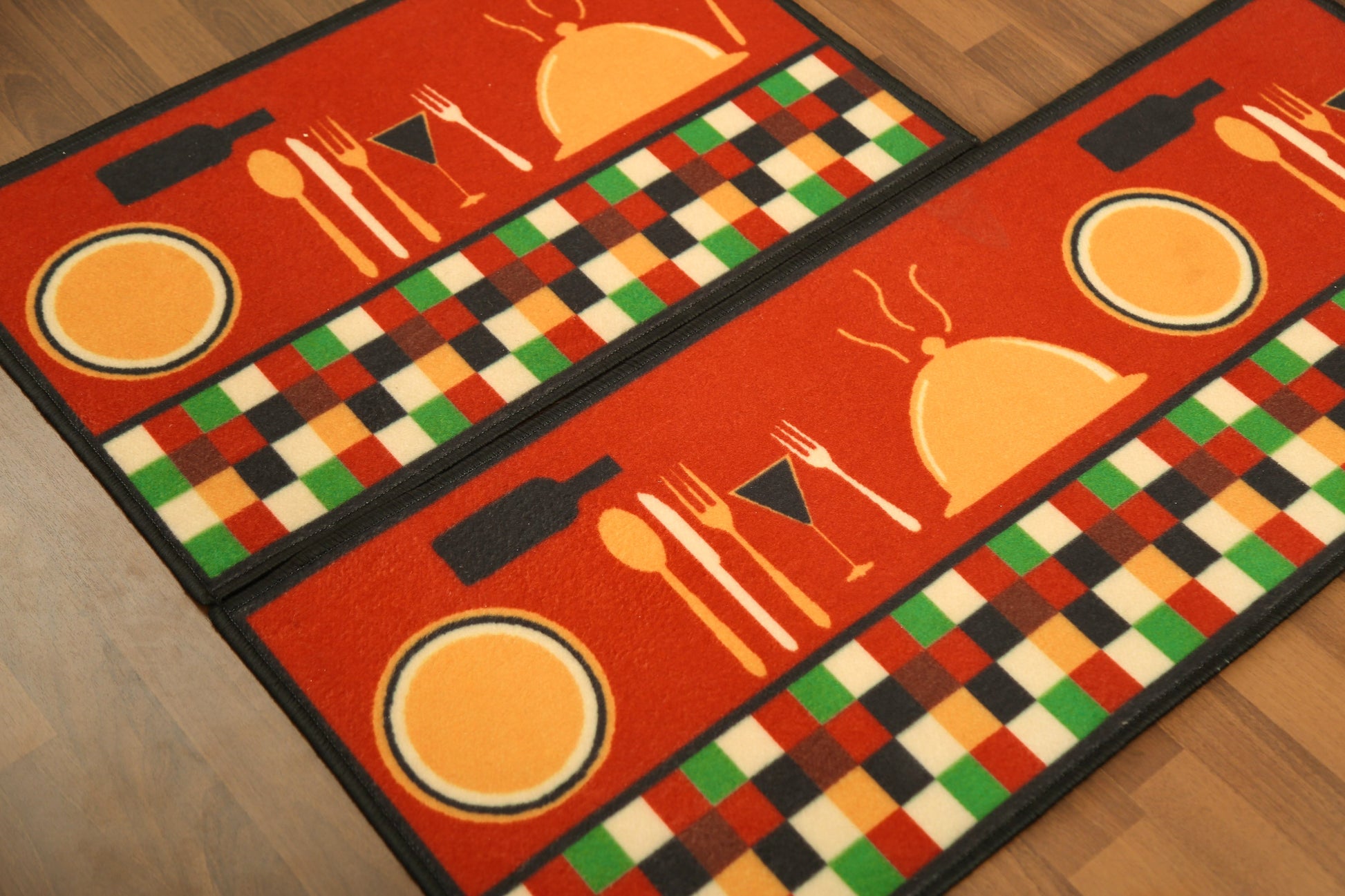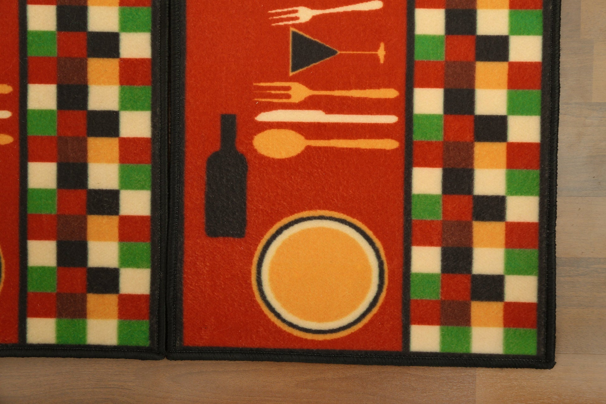 Red With Multi Color Utensils Print Kitchen Mat Set
