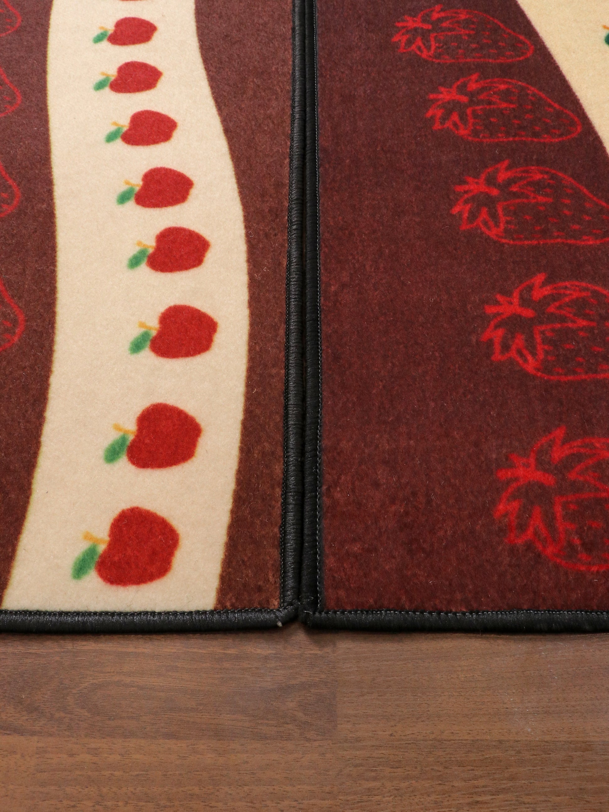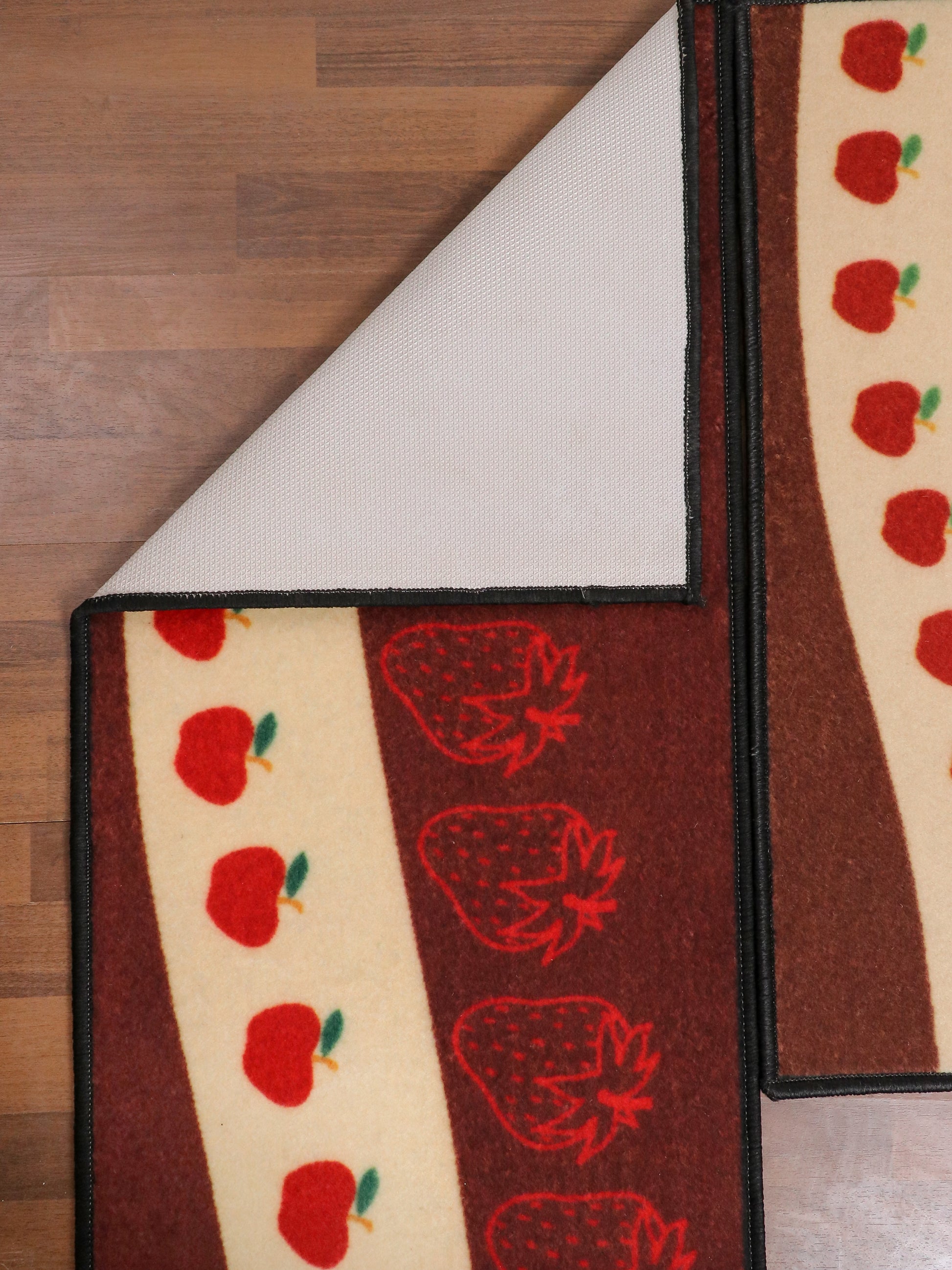 Vibrant Fruits Print This kitchen mat set features a vibrant red and beige fruits print that adds a delightful touch to your kitchen decor. The charming design brings a fresh and lively atmosphere to your cooking space.
