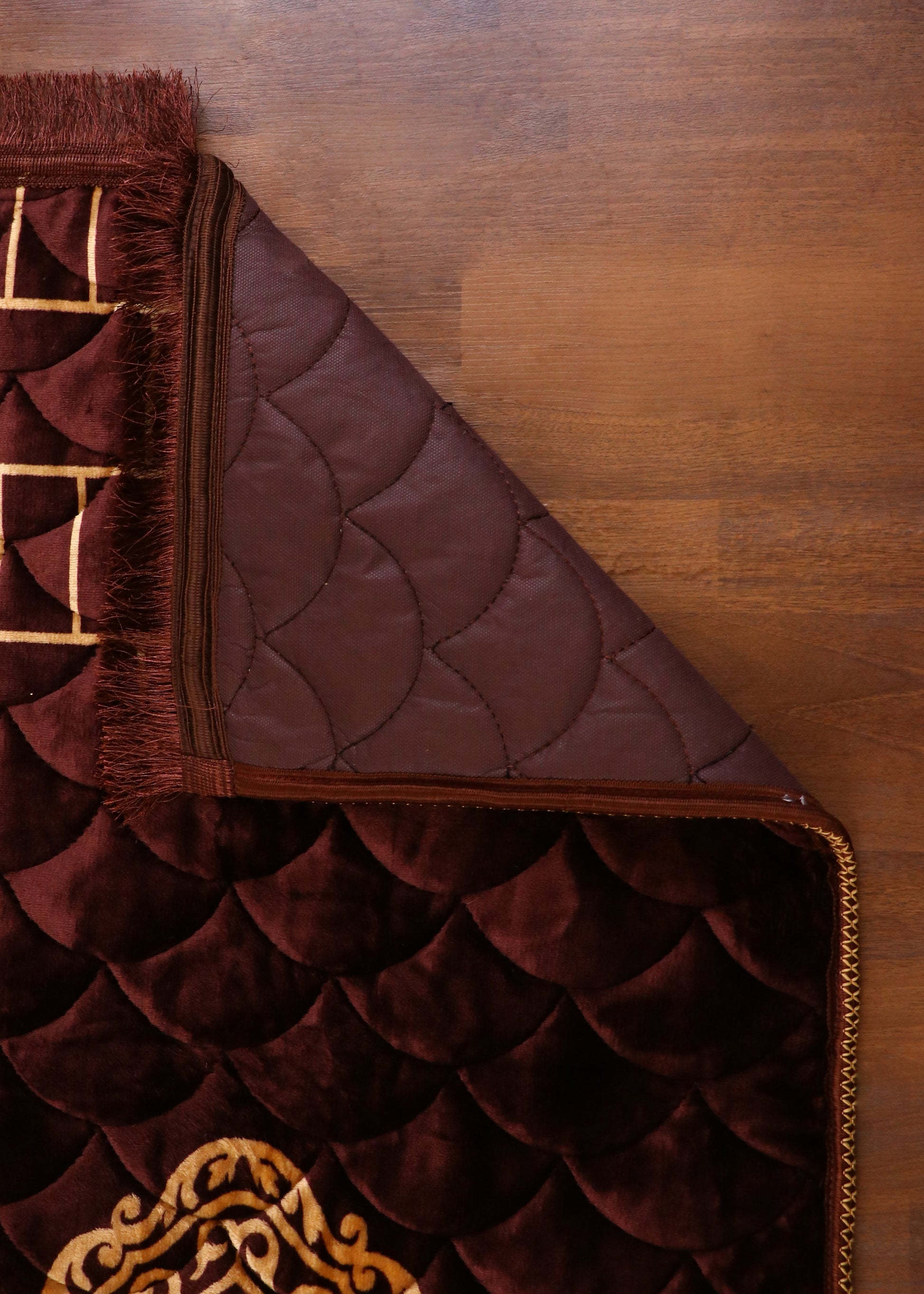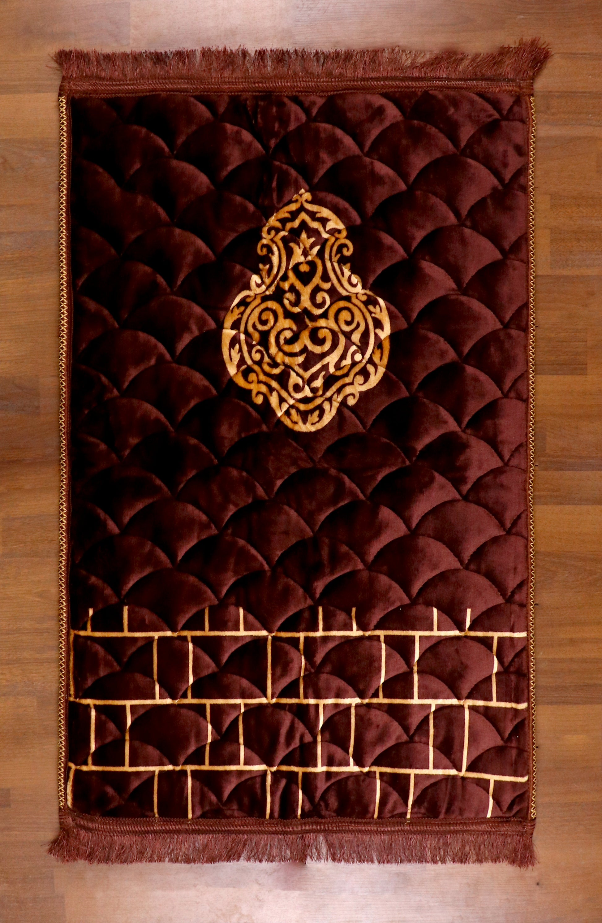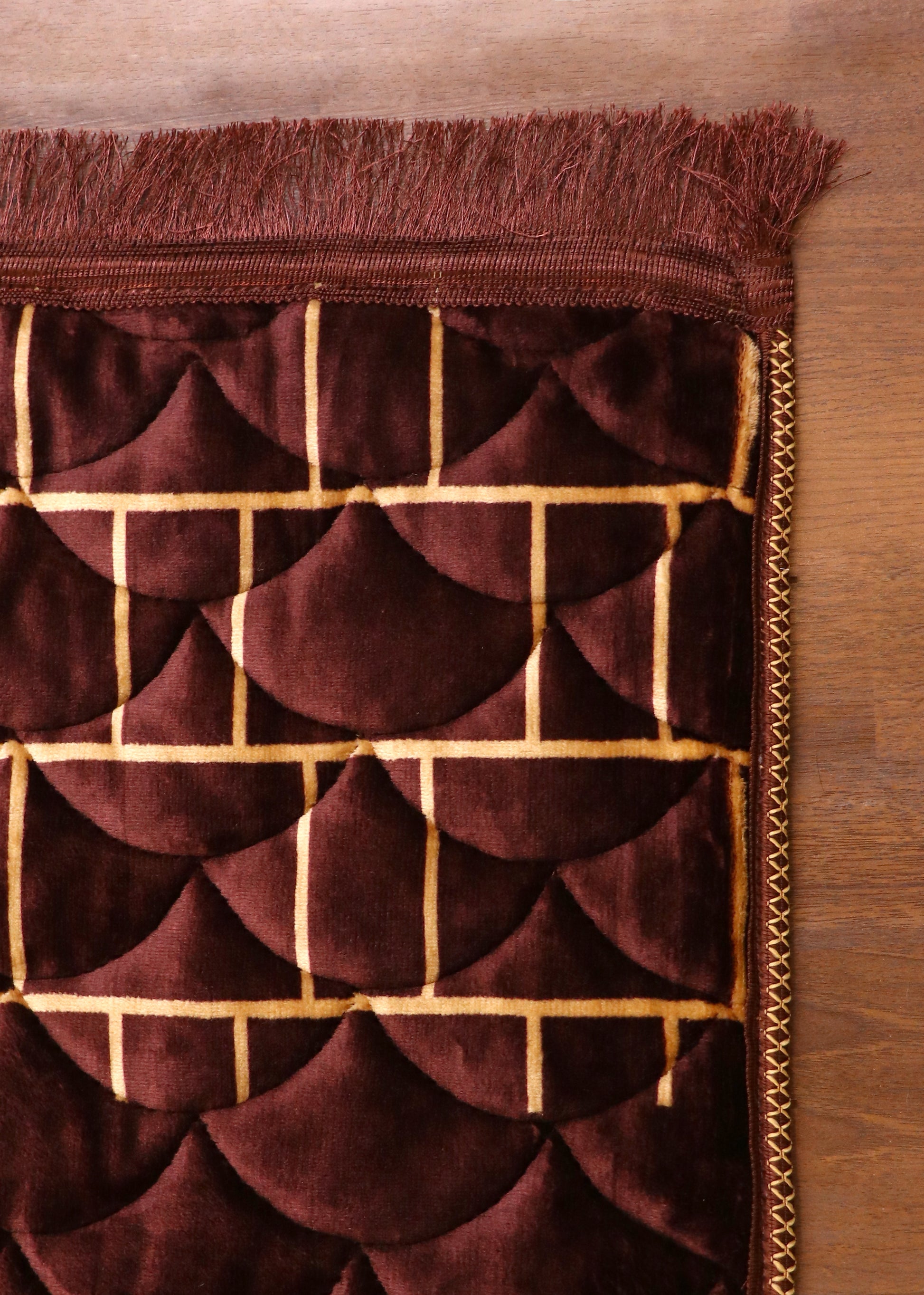 Enhance your prayer experience with the Mihrab Arch Quilted Brown Prayer Mat, crafted from premium brown velvet with soft foam quilting for comfort and durability. The centerpiece features a prominent mihrab arch/mosque dome pattern in a slightly lighter shade of brown, filled with intricate Islamic geometric motifs. Quilted edges and delicate fringes at the top and bottom add elegance and strength. Its cushioned design provides extra support for knees and joints, making it ideal for daily prayers at home, mosque use, travel, or as a thoughtful gift for Umrah and Hajj.