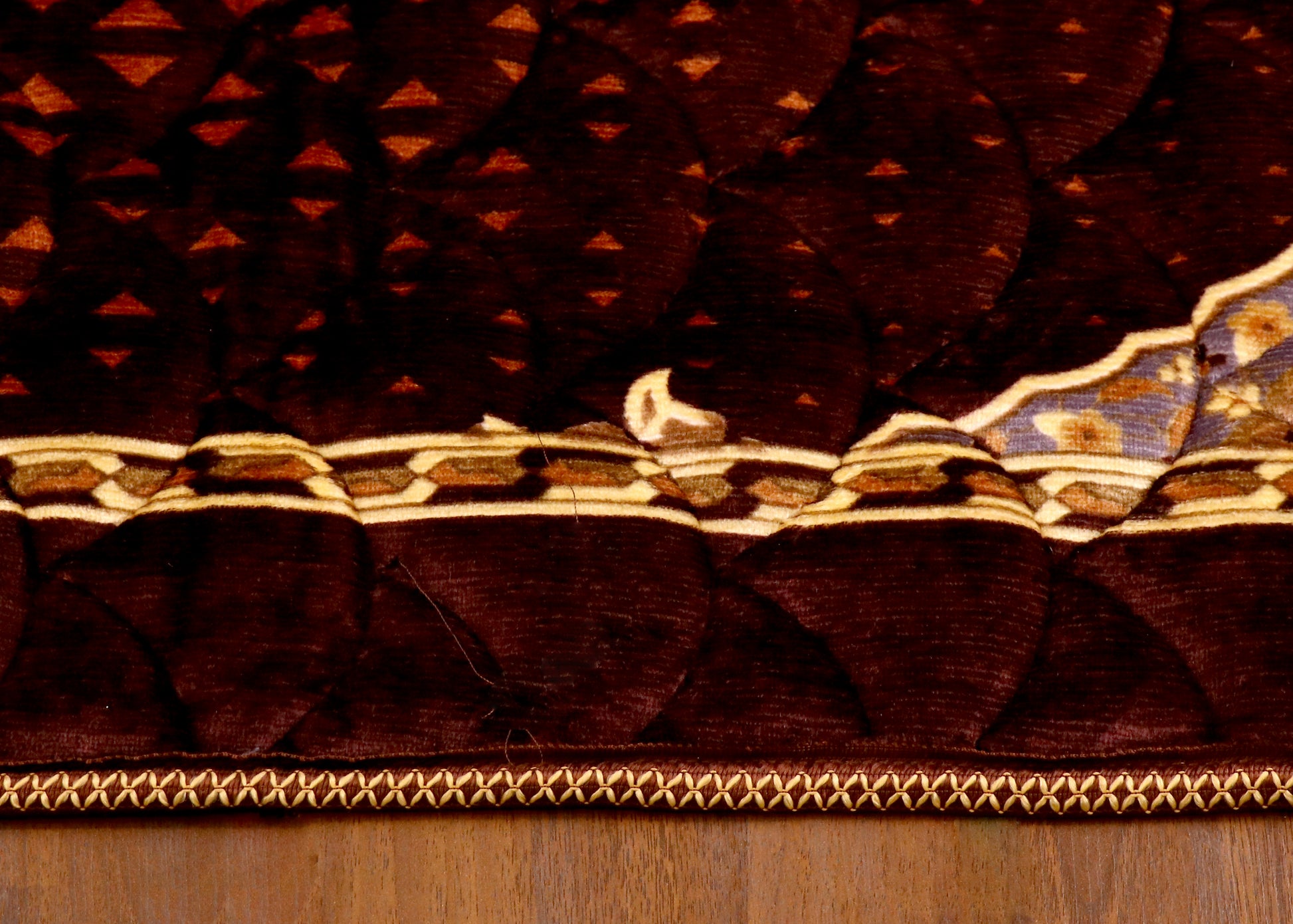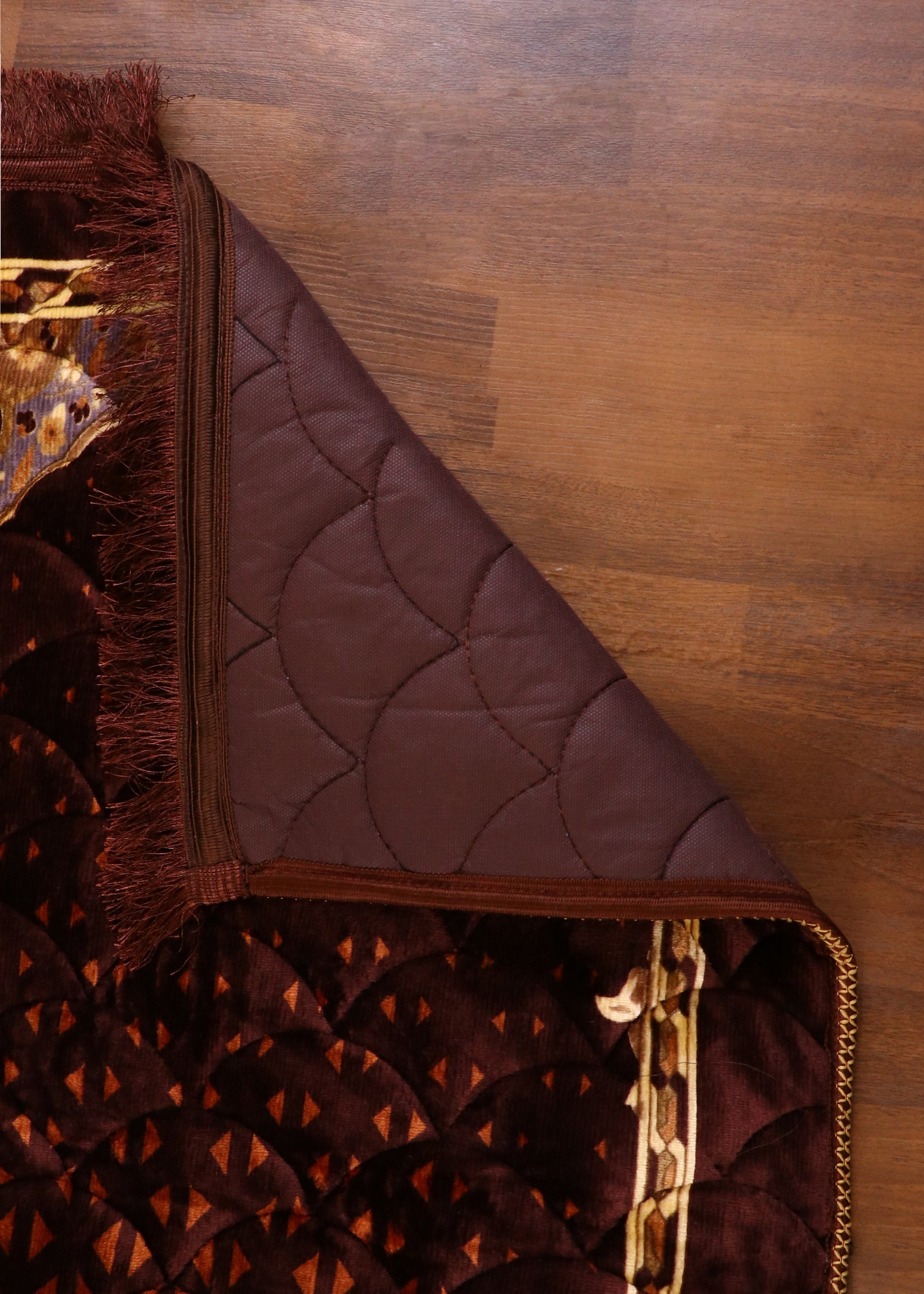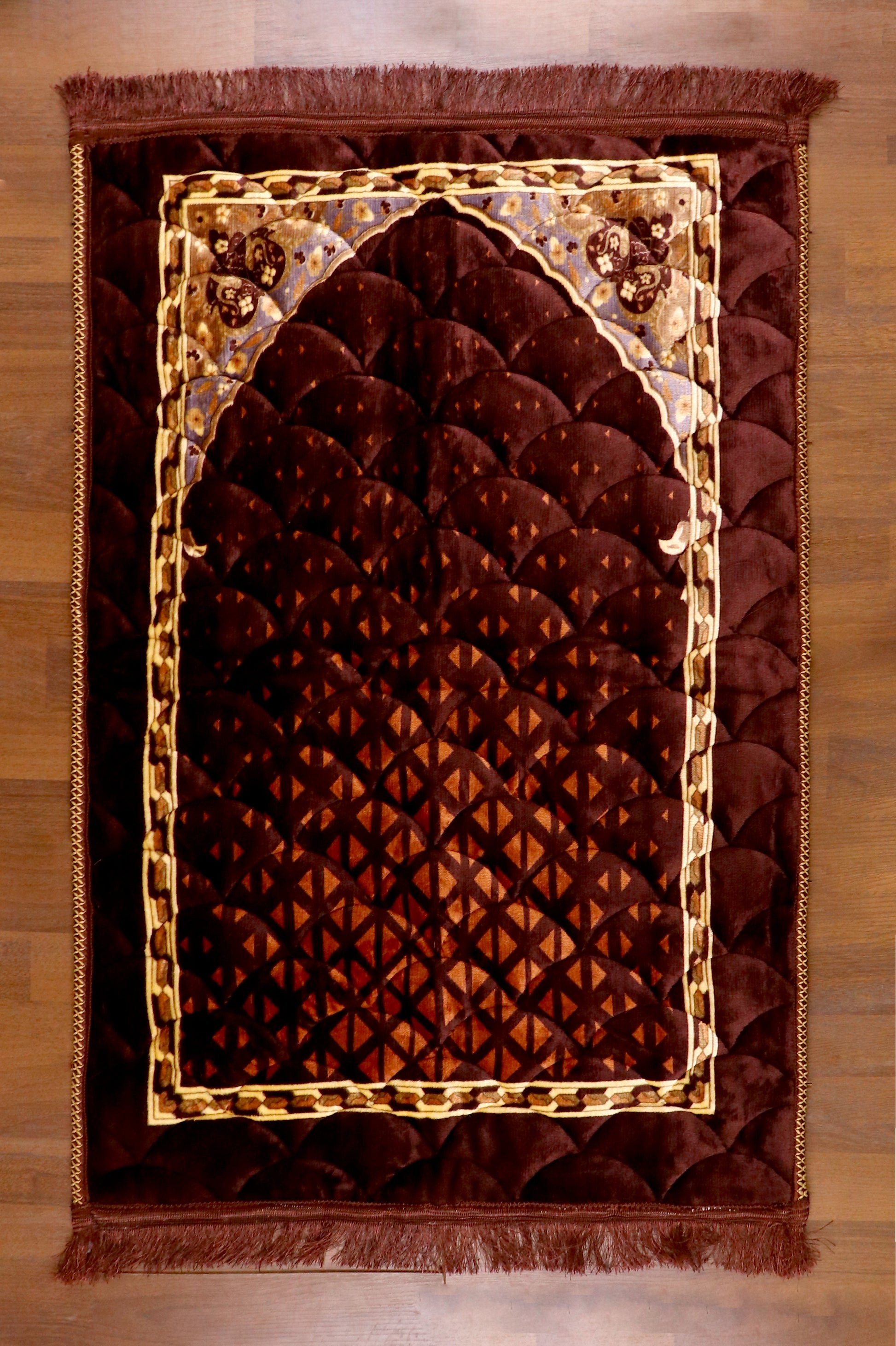 Enhance your daily prayers with the Golden Accent Mihrab Prayer Mat, crafted from premium brown velvet with a soft, quilted texture for comfort and durability. The mat features a prominent mosque arch (mihrab) design with intricate geometric patterns, highlighted by elegant golden accents that outline the arch and decorative details. Its cushioned surface provides extra support for knees and joints, making it ideal for home use, mosque prayers, travel, or as a thoughtful gift for Umrah and Hajj.