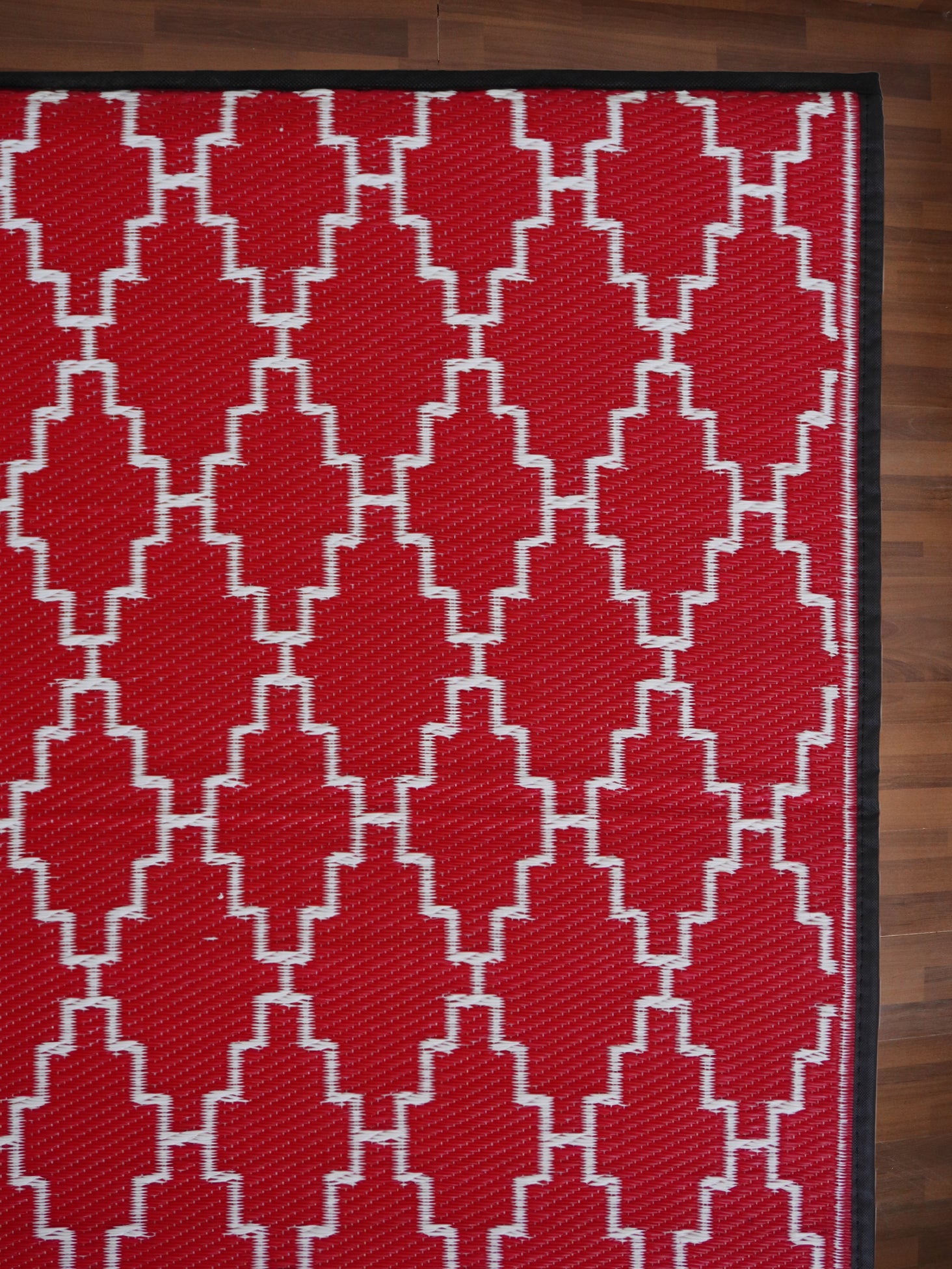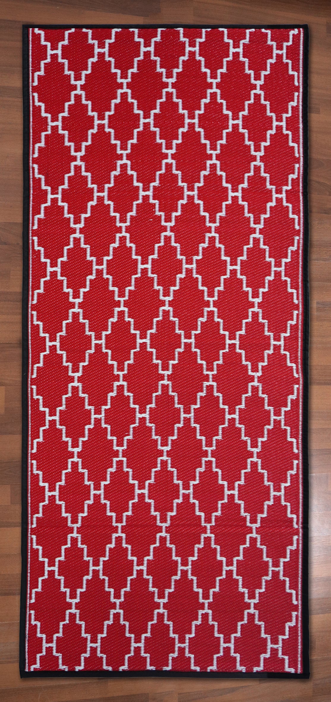 Contemporary Outdoor Elegance Transform your outdoor space with our Red Outdoor Runner featuring a timeless White Geometric Pattern, adding a touch of modern elegance to your patio, balcony, or garden.