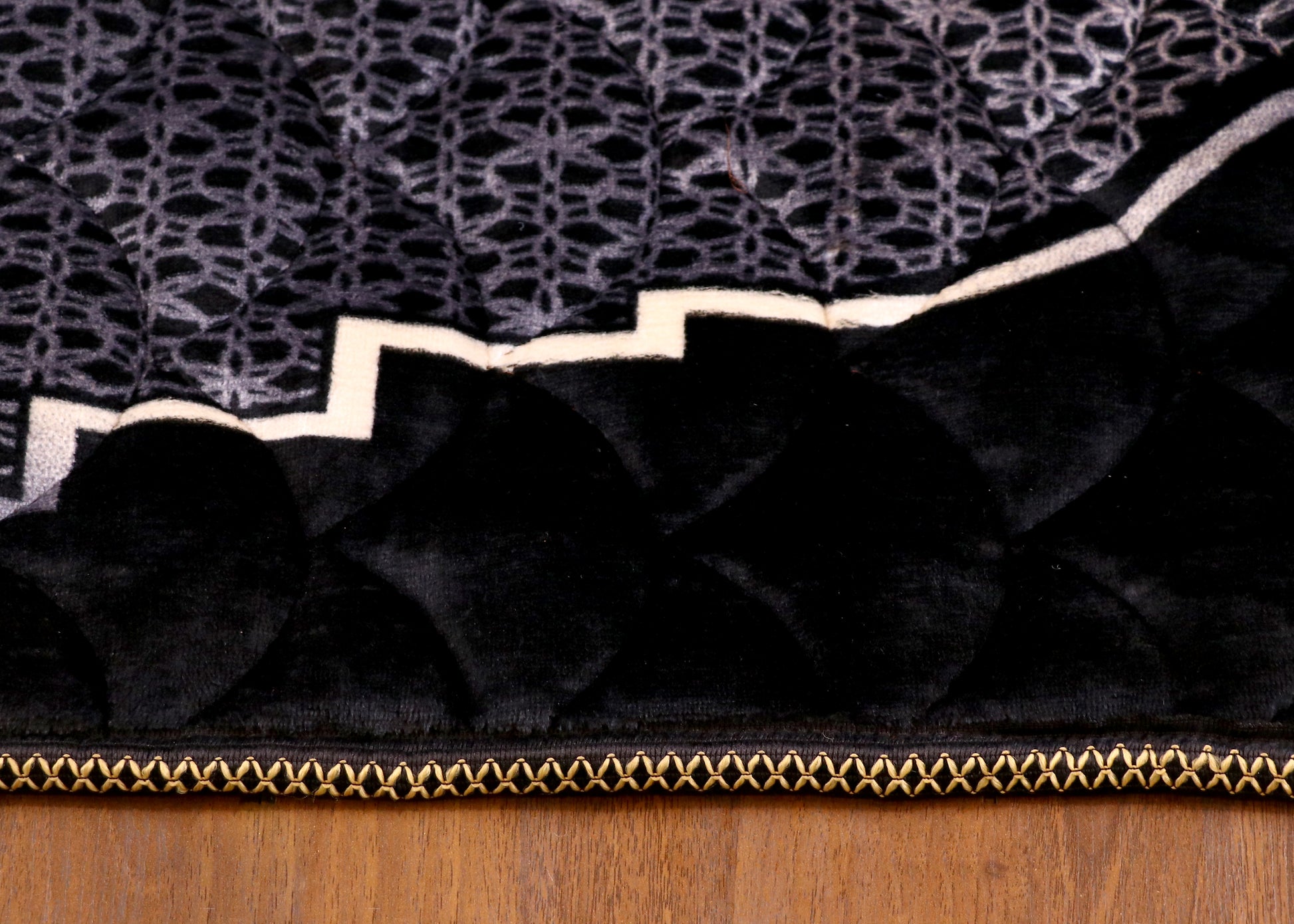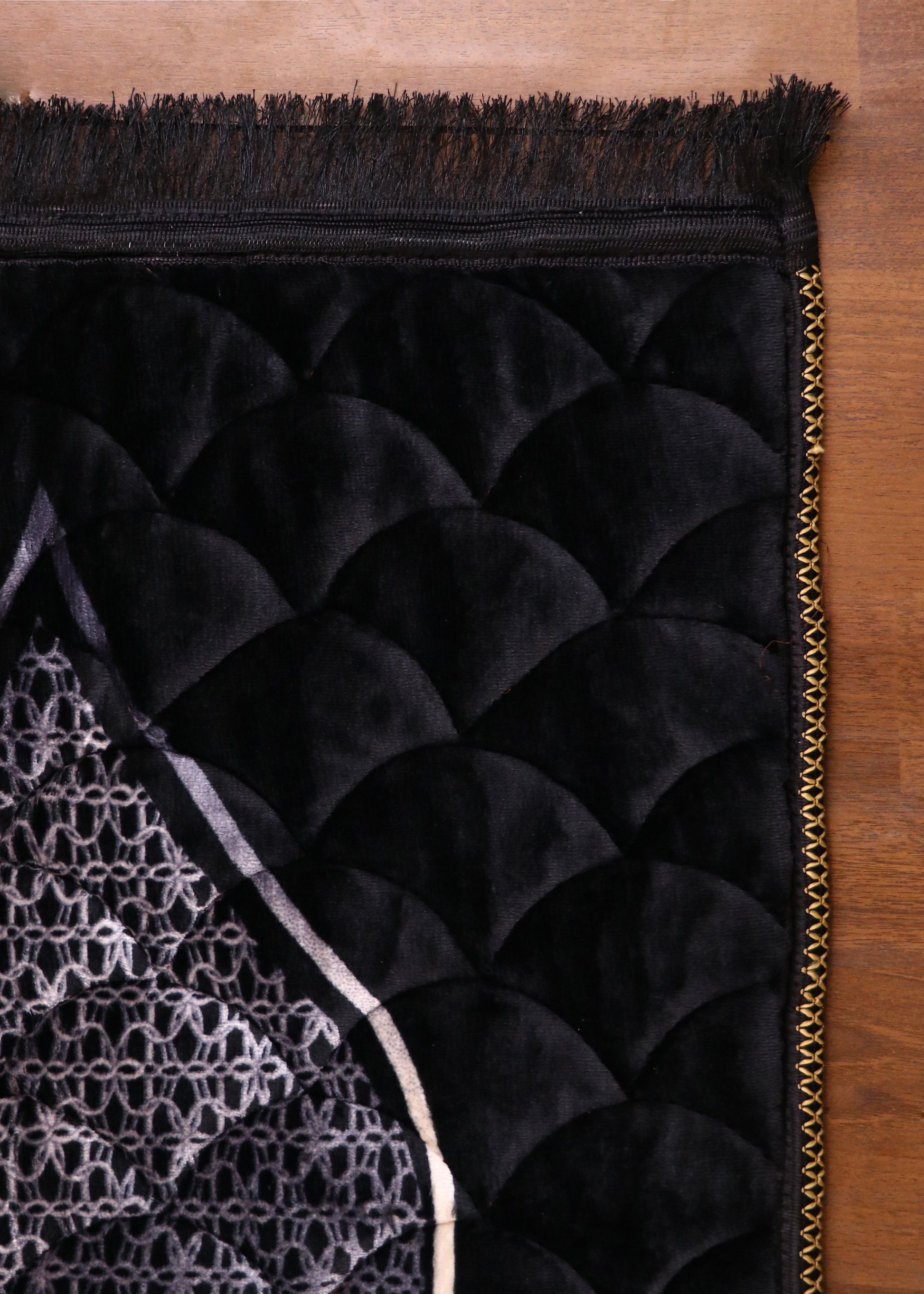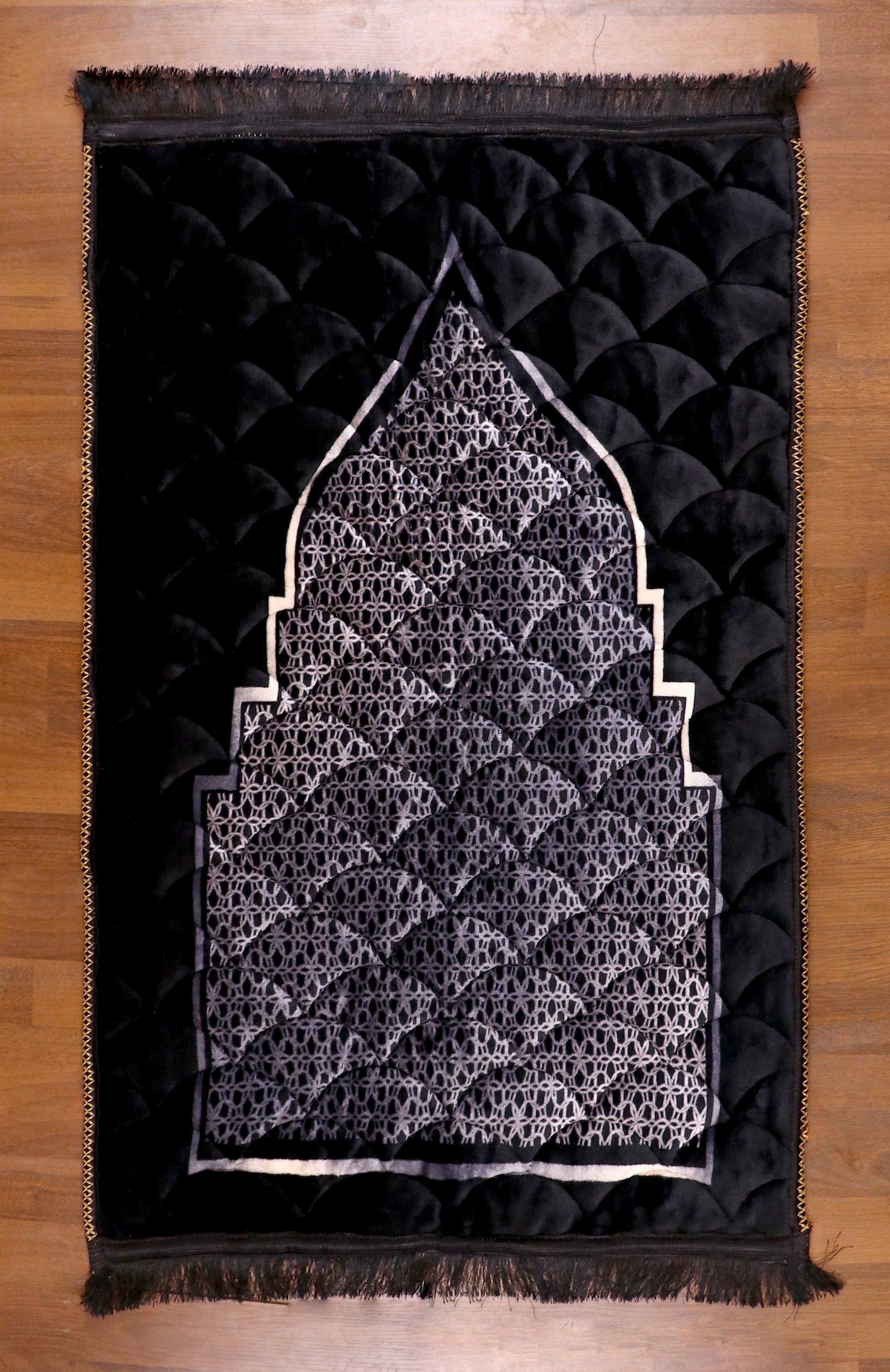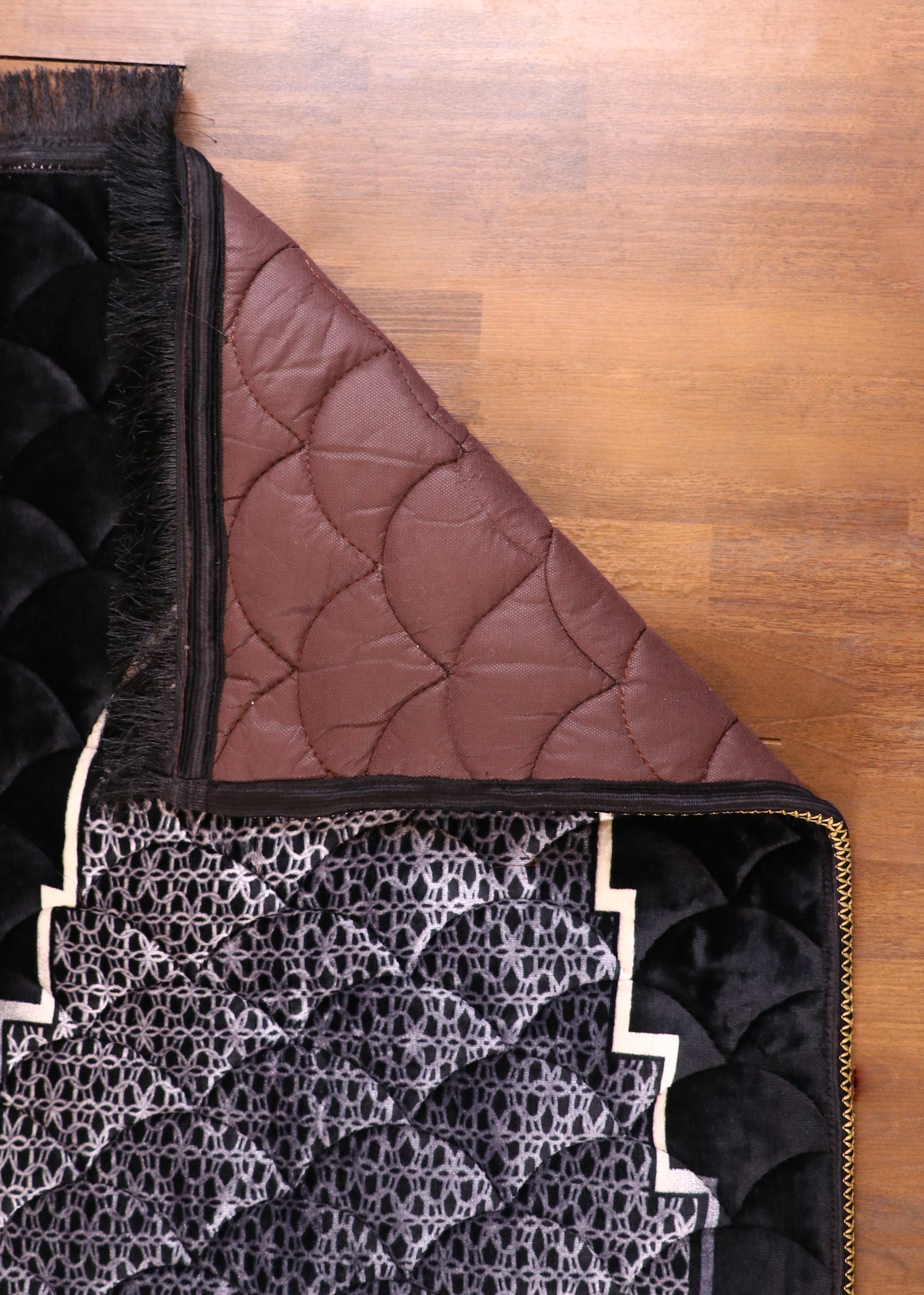 Elevate your prayer experience with our Velvet Quilted Black Prayer Mat, designed for comfort and style. The mat features a prominent mosque dome or mihrab arch pattern in a subtle contrast, intricately decorated with elegant Islamic geometric motifs. Its premium velvet with foam quilting provides a soft, cushioned surface, perfect for knees and joints during daily prayers. Quilted edges and delicate fringes at the top and bottom add a refined and durable finish, making it suitable for home, mosque, travel, or gifting.