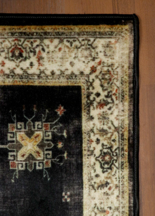 Vintage Black Rug with Cream Border & Intricate Pattern