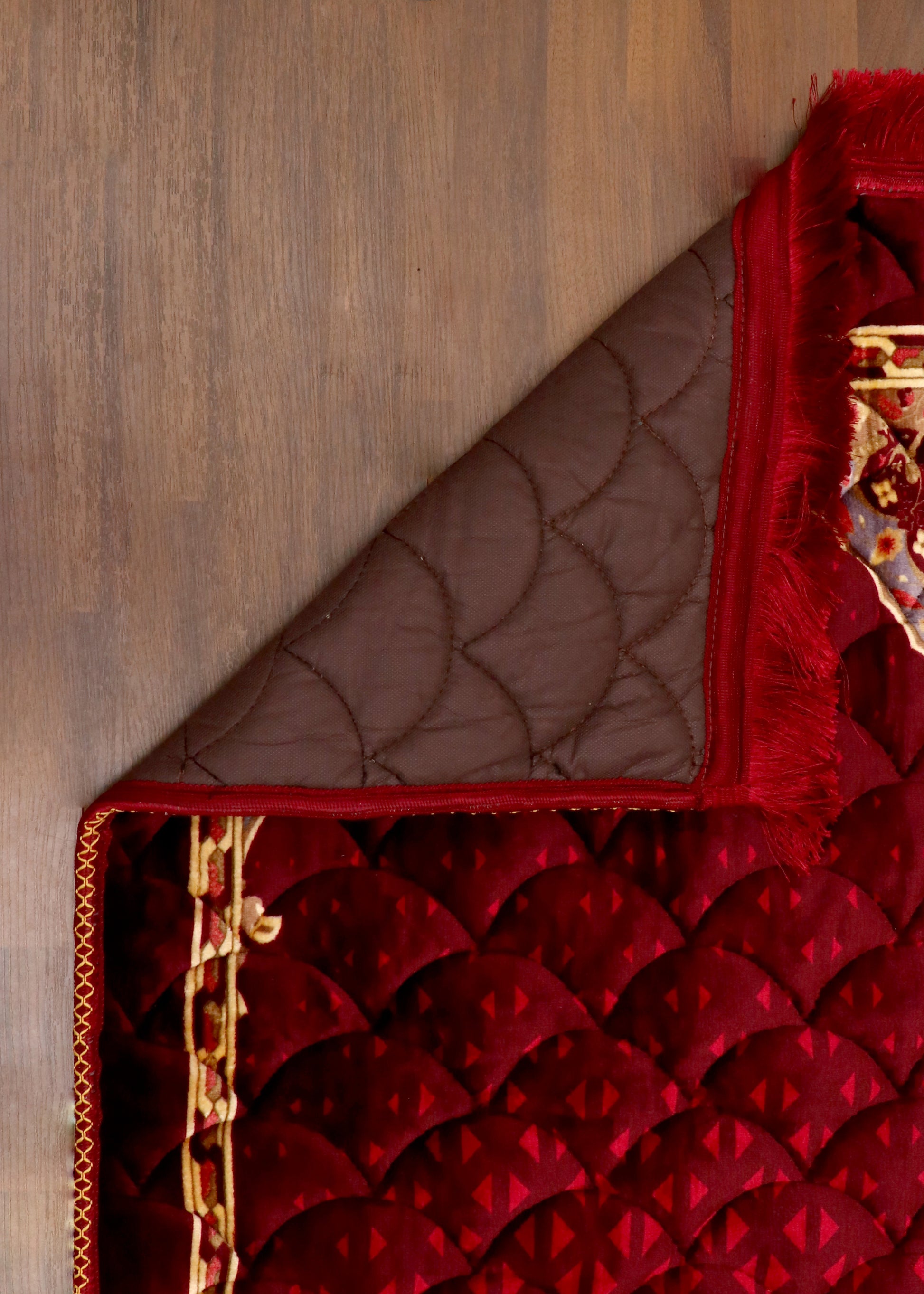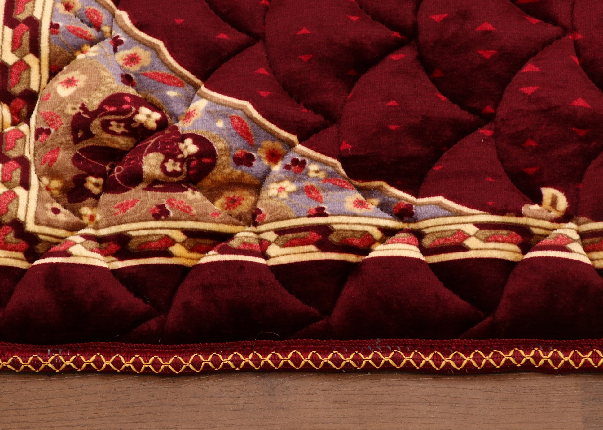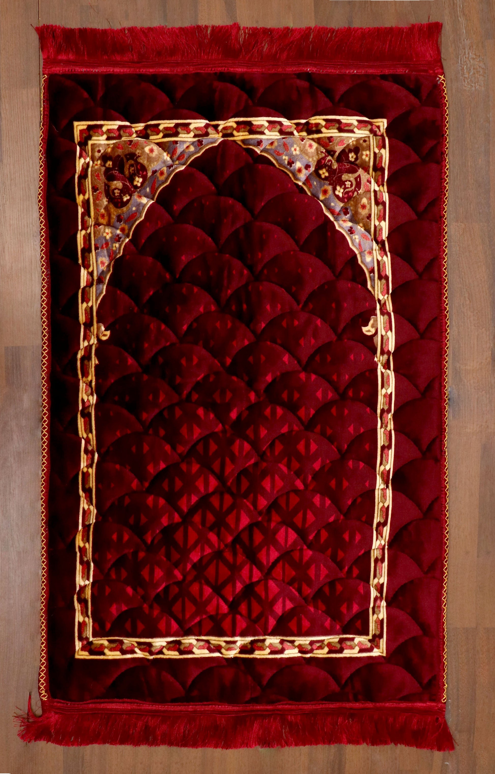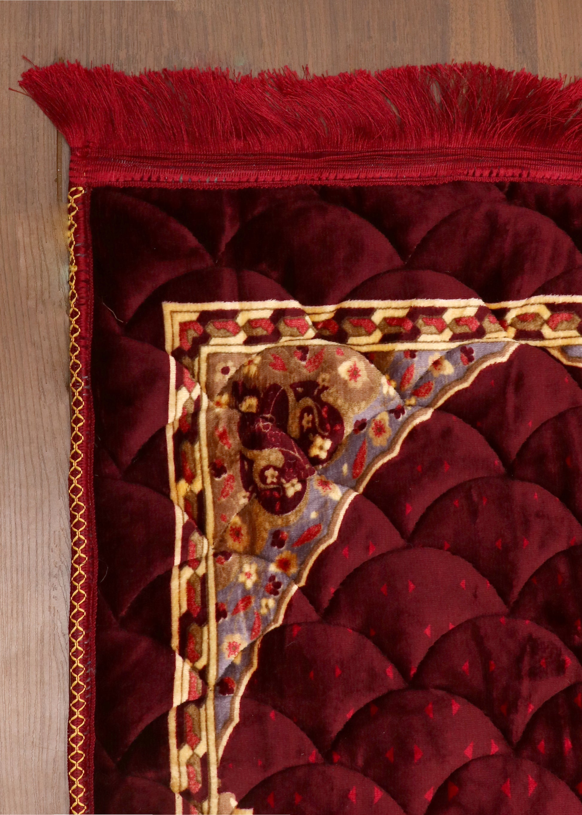 Elevate your prayer experience with our Maroon Velvet Quilted Prayer Mat, crafted from premium velvet fabric with soft foam quilting for extra comfort and support. The rich maroon shade is beautifully framed with an intricate gold border, while the arch-shaped mihrab design at the top reflects traditional Islamic artistry.