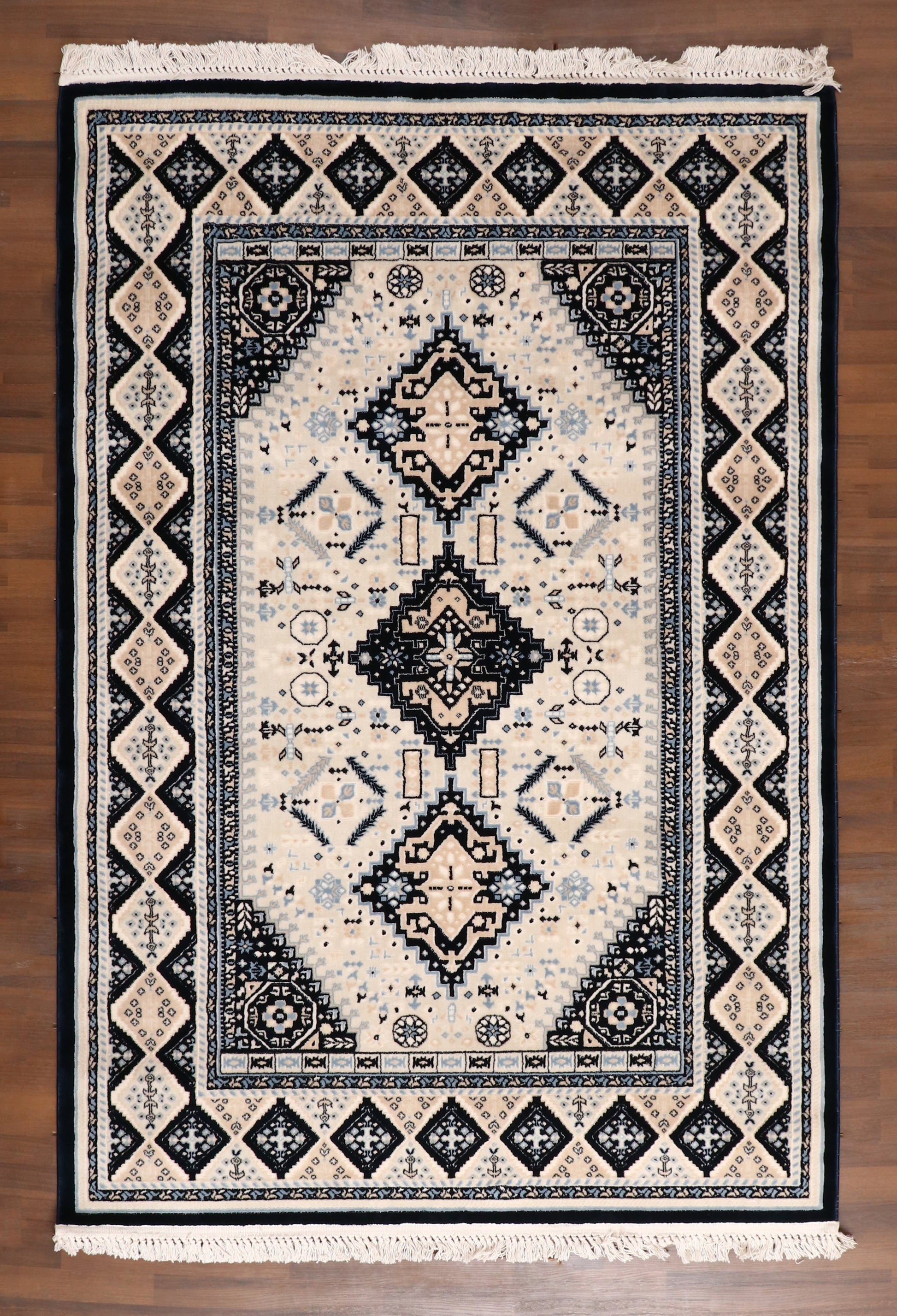 Traditional Turkish Tribal Rug – Black, Ivory & Beige Geometric Pattern
